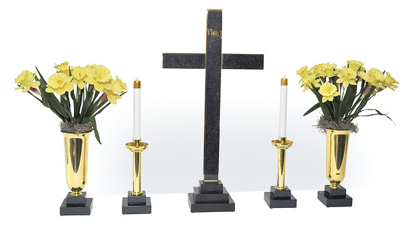 Altar set fashioned with copper flecked black granite inlay. Complete set includes cross (INRI emblem, 27 1/4" h x