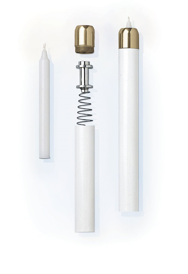 Give your candlesticks and candelabras a pristine look with these tube candles. Concealed spring feeds a small inside candle into the flame to provide total burning at a constant height. These 11" x 3/4" tube candles have brasstone tops, and are for use with candlesticks with 3/4” sockets. Holds candle that measures 17/32" in diameter. Recommended candle replacement - 846786012031.