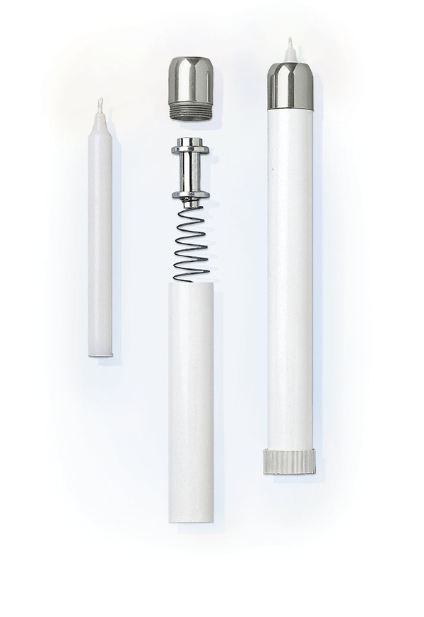 Avoids dripping wax. Concealed spring feeds a small inside candle into the flame to provide total burning at a constant height. These 13-3/8" x 1-1/2" tube candles have silvertone tops, and are for use with candlesticks with 1-1/2” sockets. Holds candle that measures 3/4" in diameter. Recommended candle replacement - 846786011980.