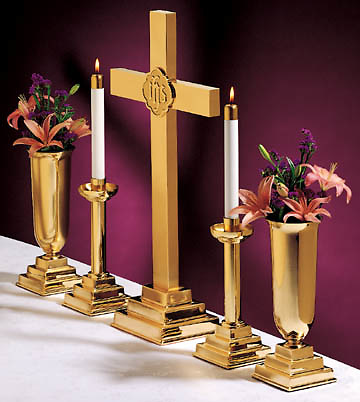 This 5-piece Small Solid Brass Altarware Set is ideal for any small worship area and exhibits a lasting beauty and quality that ensures practical durability in design. Set includes a 15” Cross with IHS symbol, a pair of 7” Candlesticks, and a pair of 8” Vases with liners. Available in silverplate by special order-please call our Custom Sales Team at 1-800-237-7511 for information.