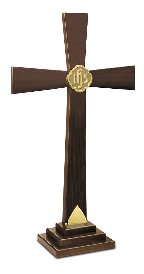 Hand selected walnut wood altar cross with bright finish brass accents. IHS symbol. Cross 24" h, 12 1/2" crossarm, 4 lbs. Made in the USA.