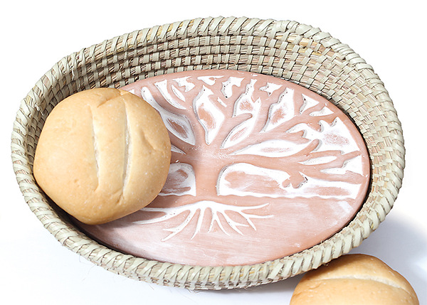 Whitewashed terra cotta is deeply incised with Tree of Life, and sits within a handwoven kaisa grass basket with palm wrap. Warmer is oven safe.