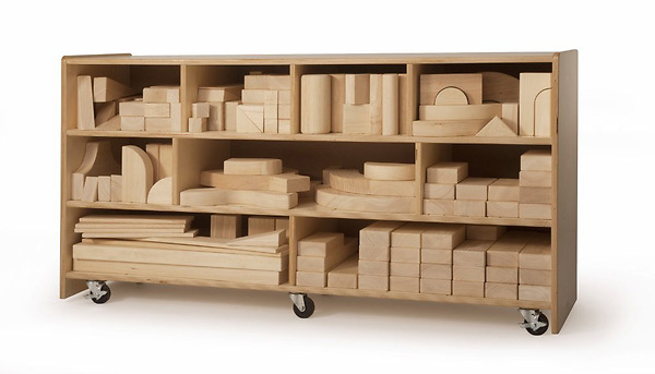 Our best-selling blocks cabinets provide plenty of storage space for a variety of blocks, toys or books. Shown here is our Big Block Cabinet with the Quarter School Block Set - 713863003728 [blocks sold separately]. Constructed in beautiful, durable birch laminate in safe, non-toxic natural UV finish that won't yellow or fade and withstands rigorous use by children. Ships UPS/FedEx Ground fully assembled. Made in the USA. GreenGuard™ Gold certified. Lifetime Warranty.