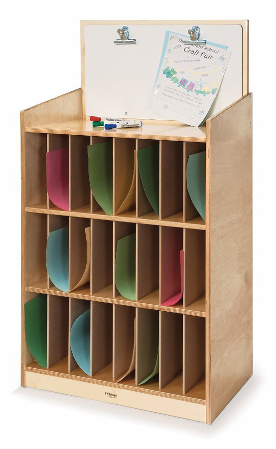 Twenty four mail slots for messages to parents, children, and parents. Mounted to the top of the unit is an erasable marker board with two handy clips for posting daily news and schedules. 25" wide x 33" high x 15" deep. FEDEX or UPS ground. GreenGuard Certified. Made in USA. Lifetime Warranty.