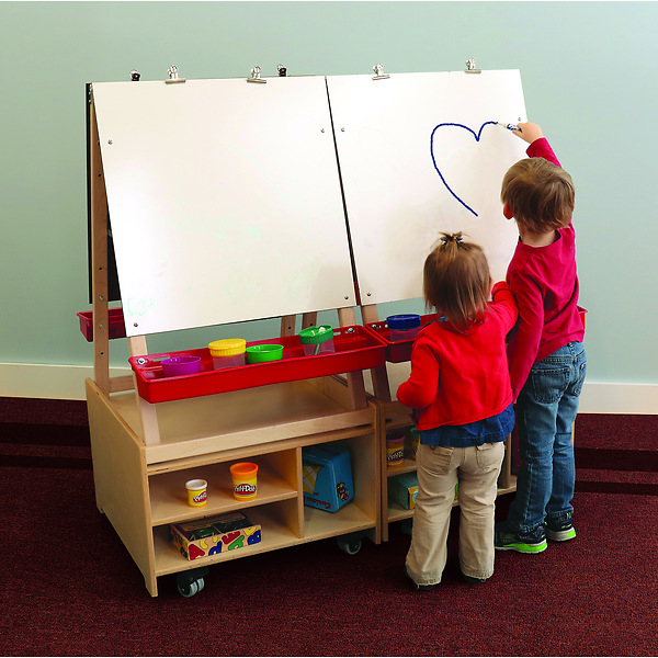 Inspire their next masterpiece! Art is a window to the world and this mobile art station provides four children a unique and stylish platform to create and express their own views. The design of the sturdy base cabinet provides ample storage for all your art supplies below and in between the removable tabletop easels. Each side of the easel includes a write and wipe panel, clips and an adjustable height paint tray. The cabinet is mounted non-marking lockable casters for handy mobility. Constructed in beautiful, durable birch plywood in safe, non-toxic natural UV finish that won't yellow and withstands rigorous use. Made in USA. GreenGuard™ Gold certified. Lifetime Warranty.