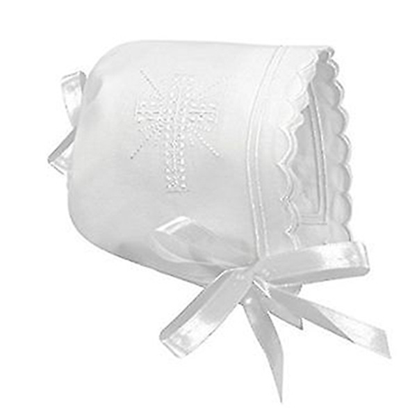 Handmade baby bonnet is crafted from a vintage style handkerchief, with embroidered cross and border design and scalloped edging. Satin ribbon bow trim and tie.A unique keepsake that can be tucked away until baby's wedding day... then the stitching can be removed and this becomes a keepsake handkerchief, a "something old" to carry on the day she gets married.