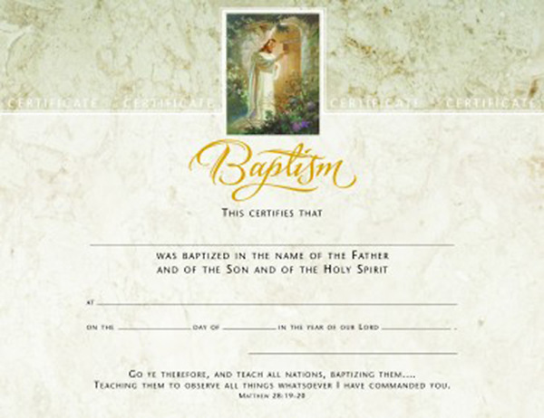 BaptismTHIS CERTIFIES THAT(blank line)WAS BAPTISED IN THE NAME OF THE FATHERAND OF THE SON AND OF THE HOLY SPIRITAT (blank line)ON THE (blank line) DAY OF (blank line) IN THE YEAR OF OUR LORD(blank line)GO YE THEREFOR, AND TEACH ALL NATIONS, BAPTIZING THEM... TEACHING THEM TO OBSERVE ALL THINGS WHATSOEVER HAVE COMMANDED YOU.MATTHEW 28:19-20