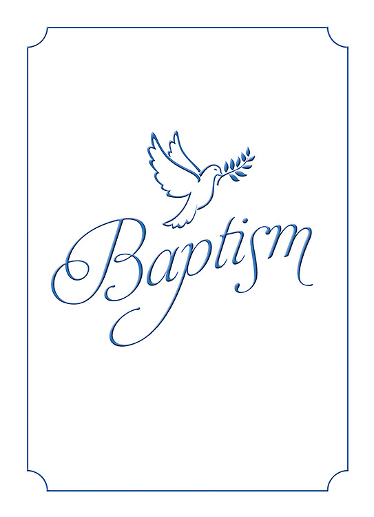Dove with blue foil embossed folded baptism certificate on premium stock. Certificate text includes Mark 16:16 (KJV), 5" x 11", pack of 6