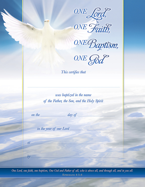 This certifies that _____ was baptized in the name of the Father, the Son, and the Holy Spirit on the _____ day of _____ in the year of our Lord _____ at _____ by _____