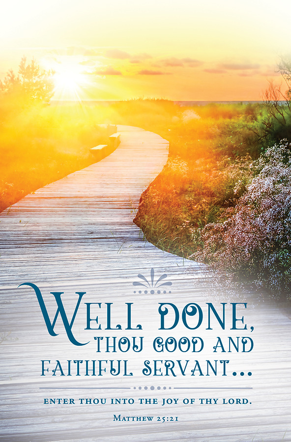 Well Done regular size bulletins feature the Scripture verse: Well done, thou good and faithful servant...enter thou into the joy of thy Lord. Matthew 25:21 (KJV).