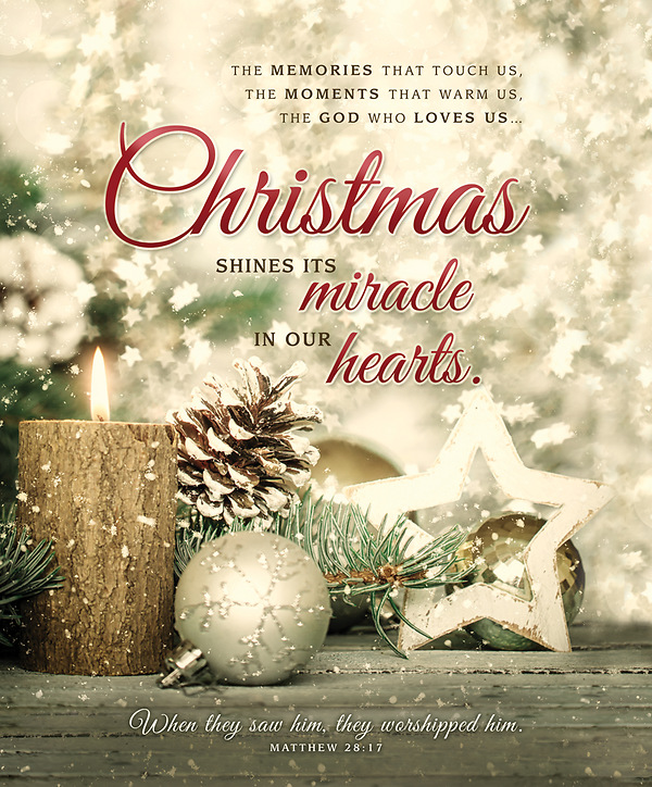 The bulletin is shown folded (8.5" x 7"), exactly as church members and visitors will receive it. The back side is blank to include the information you choose. Worship bulletins arrive packaged flat 8.5" x 14" to fit into your printer or copier; shrink wrapped in packages of 100. Part of a Christmas matching set.