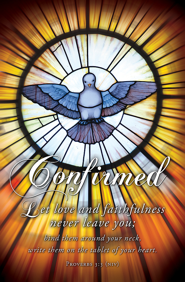 A trendy bulletin featuring a pretty white dove that can be used for Confirmation occasions. Text: Confirmation Scripture: “Let love and faithfulness never leave you; bind them around your neck, write them on the tablet of your heart.” Proverbs 3:3 (NIV)