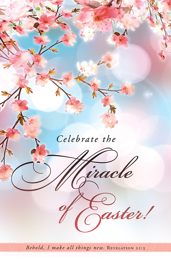 An enjoyable bulletin featuring a lovely Cherry Blossom in that can be used with the Easter occasion. Text: “Celebrate the Miracle of Easter! Behold, I make all things new.” Revelation 21:5 (NLT)