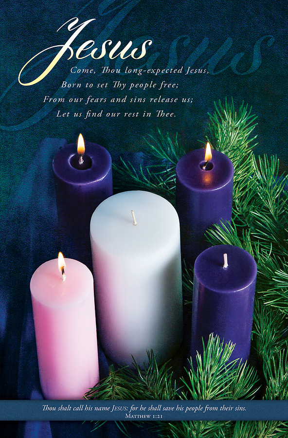 Beautiful regular sized bulletin for the third week of Advent. Text: Jesus - Come, Thou long-expected Jesus, Born to set Thy people free; From our fears and sins release is; Let us find our rest in Thee. - Thou shalt call his name Jesus; for he shall save his people from their sins. Matthew 1:21.