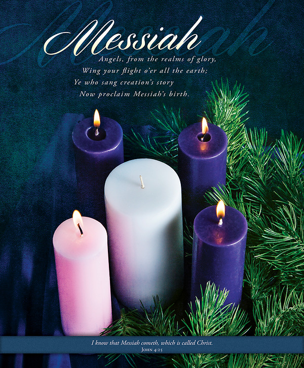Beautiful legal sized bulletin for the fourth week of Advent. Text: Messiah - Angels, from the realms of glory, Wing your flight o'er all the earth; Ye who sang creation's story Now proclaim Messiah's birth. I know that Messiah cometh, which is called Christ. John 4:25.