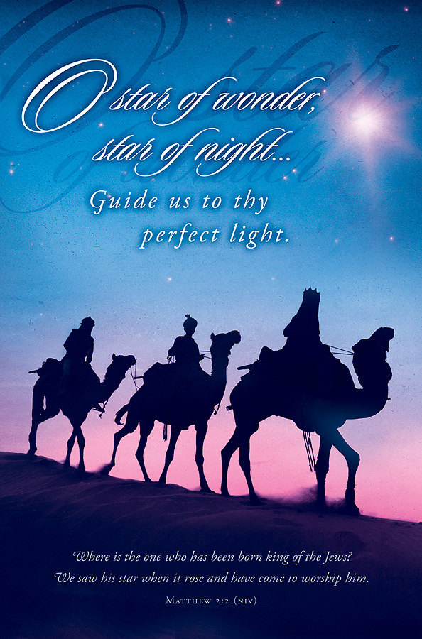 Features silhouette of the three wise men with the text: O star of Wonder, star of night...Guide us to thy perfect light. Where is the one who has been born king of the Jews? We saw the star when it rose and have come to worship him. Matthew 2:2 (NIV).