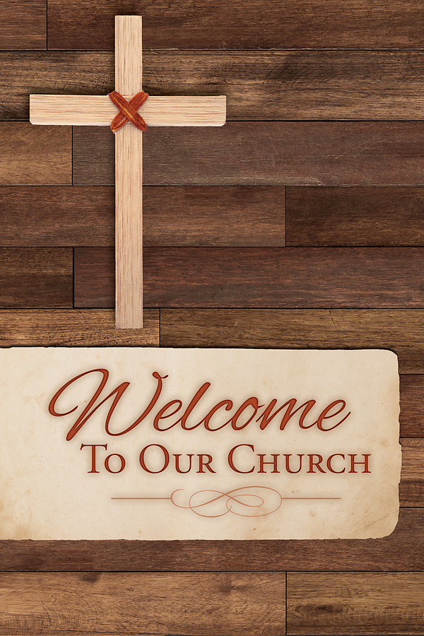 6" x 9" Welcome folder sold in packs of 12. Features and wood background with a wooden cross. Text: Welcome to our Church. Psalm 144:15 (NIV).