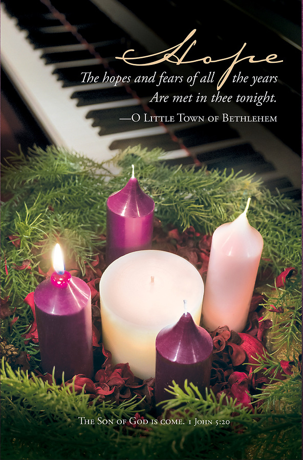 An insightful Advent bulletin featuring the 5 candles used to celebrate the Advent season and the birth of Christ. Size: 8.5" x 11" folds to 5.5" x 8.5" Text: Hope. Hymn: The hopes and fears of all the years Are met in thee tonight – O Little Town of Bethlehem. Scripture: “The Son of God is come.”1 John 5:20. KJV.