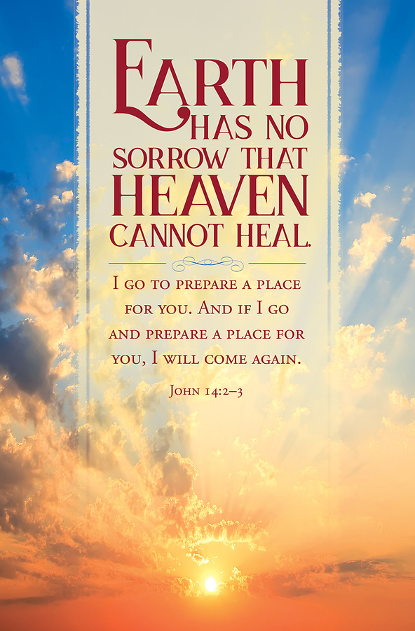 This regular size funeral bulletin features the comforting words from our Savior, along with a reminder from Thomas Moore. Quote: "Earth has no sorrow that heaven cannot heal." Scripture: "I go to prepare a place for you. And if I go and prepare a place for you, I will come again. (John 14:2-3, KJV)." Size: 8.5" x 11" folds to 5.5" x 8.5"