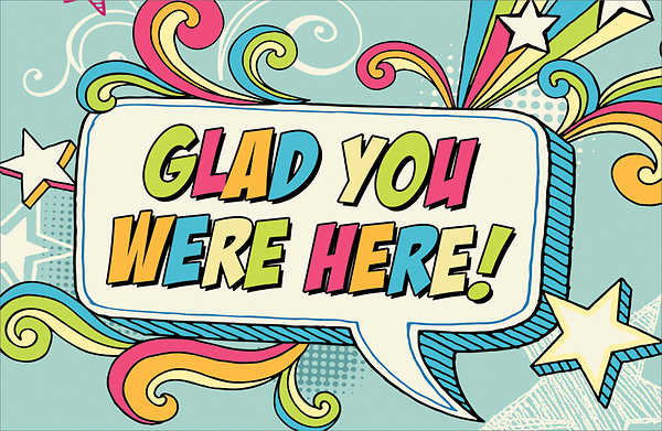 Use this postcard to send the important message to young people that they are valued. The front shows brightly-colored scrolling designs and stars, along with a bubble message that reads, "Glad you were here!" The back has space for writing a personal message as well as showing 1 John 5:2 (KJV), which reads, We love the children of God. These 3.5" x 5.5" full-color postcards come shrink-wrapped in a package of 25.