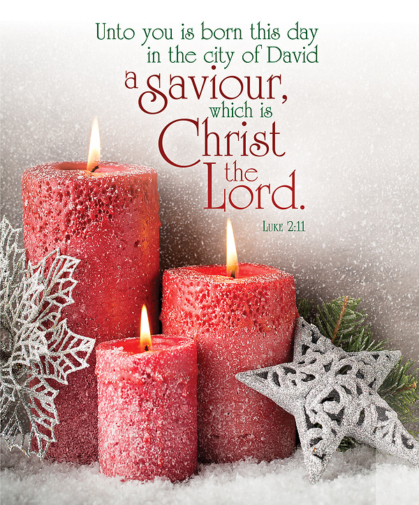 A decorative legal size Christmas bulletin featuring red burning Christmas candles. Scripture: “Unto you is born this day in the city of David a Saviour, which is Christ the Lord.” Luke 2:11 KJV. Size: 8.5" x 14" folds to 7" x 8.5"