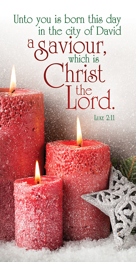 A decorative Christmas regular size offering envelope featuring red burning Christmas candles.“Unto you is born this day in the city of David a Saviour, which is Christ the Lord.” Luke 2:11 KJV.