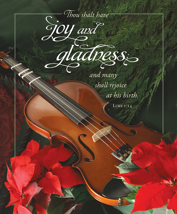 This bulletin is appropriate for any Christmas Sunday, or specifically for a Christmas musical or cantata. The image displays a violin resting on Christmas greens, with poinsettias offering a vibrant red. Size 8.5" x 14" folds to 7" x 8.5" The featured verse, designed in a formal font, comes from Luke 1:14 (KJV): Thou shalt have joy and gladness: and many shall rejoice at his birth. This bulletin is blank on the insides and back for your information.