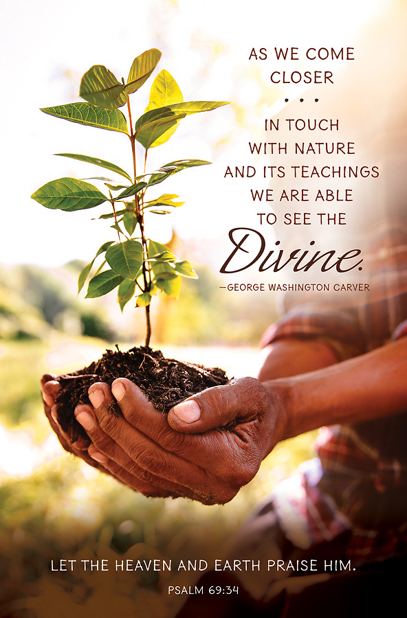 Text: As we come closer in touch with nature and its teachings we are able to see the divine - George Washington Carver. Scripture: Let the heaven and earth praise Him. Psalm 69:34 (KJV) Size: 8.5" x 11" folds to 5.5" x 8.5"