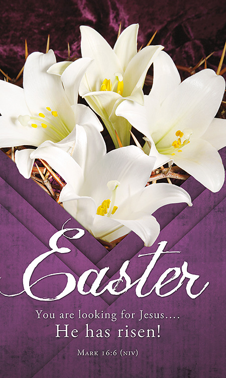 3' x 5' fabric Easter banner featuring white lilies and thorns in the background. Banner has pole pockets for hanging from t-style banner stands or dowel kits.