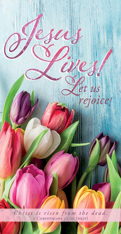 Text: Jesus lives! Let us rejoice! Scripture: Christ is risen from the dead. 1 Corinthians 15:20 (NKJV) Size: 3 1/8” x 6 1/4"