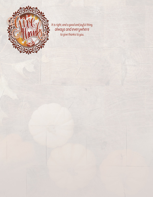 Letterhead reads: It is right, and a good and joyful thing, always and everywhere to give thanks to you. Letterhead is 8.5" x 11" and works with most printer and copiers. Can be folded to show the design in the window of a #10 Window Envelope. Sold in packs of 50. This letterhead is part of a matching set along with an offering envelope, regular size bulletin, and large size bulletin.