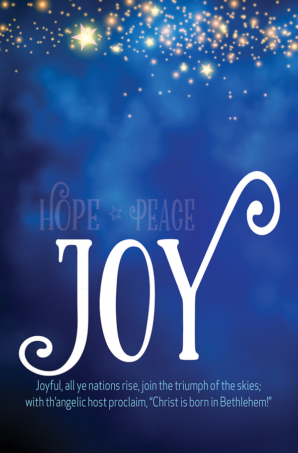 Bulletin reads: Joy Joyful, all ye nations rise, join the triumph of the skies; with angelic host proclaim, "Christ is born in Bethlehem" Bulletin is 8.5" x 11" unfolded and 5.5" x 8.5" folded. Sold in packs of 50. Also available in a large size bulletin.