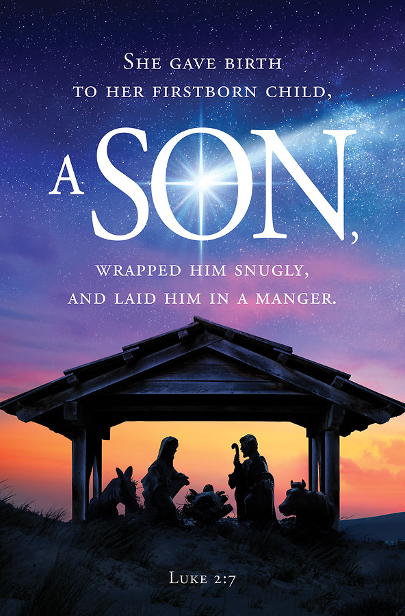 Bulletin reads: She gave birth to her firstborn child, a Son, wrapped Him snugly, and laid Him in a manger... Luke 2:1 CEB Bulletin is 8.5" x 11" unfolded and 5.5" x 8.5" folded. Sold in packs of 50. This bulletin is part of a matching set along with letterhead, an offering envelope, and a large size bulletin.