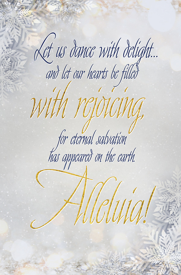 Bulletin reads: Let us dance with delight…and let our hearts be filled with rejoicing, for eternal salvation has happened on the earth. Alleluia! Bulletin is 8.5" x 11" unfolded and 5.5" x 8.5" folded. Sold in packs of 50. Also available in a large size bulletin.
