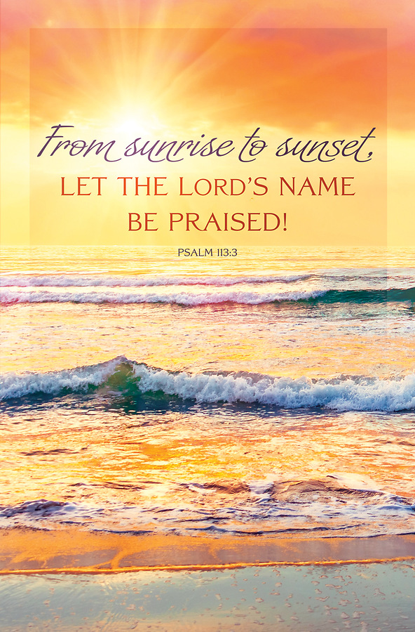 Bulletin reads: From sunrise to sunset, let the Lord's name be praised. Psalm 113:3 (CEB). Bulletin is 8.5" x 11" unfolded and 5.5" x 8.5" folded. Sold in packs of 50.