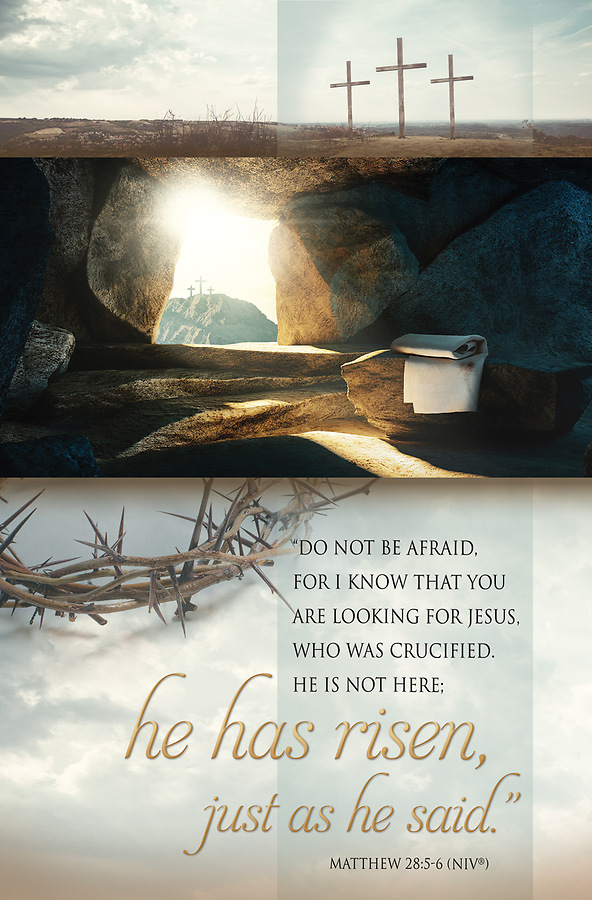 Matthew 28:5-6 (NIV). Bulletin is 8.5" x 11" unfolded and 5.5" x 8.5" folded. Sold in packs of 100. Design also available in a large size bulletin, letterhead, offering envelope, bookmark and banners.
