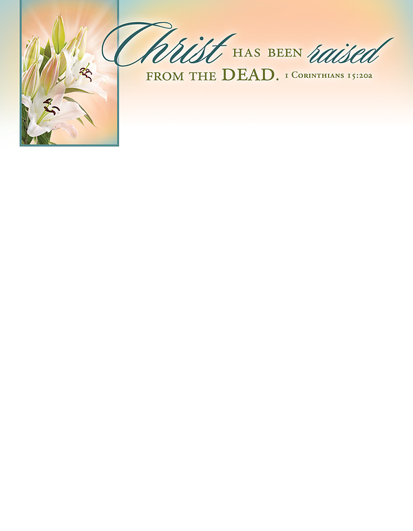 1 Corinthians 15:20a. Letterhead is 8.5" x 11" and sold in packs of 100. Design also available in a regular and large size bulletin, offering envelope, bookmark and banners.