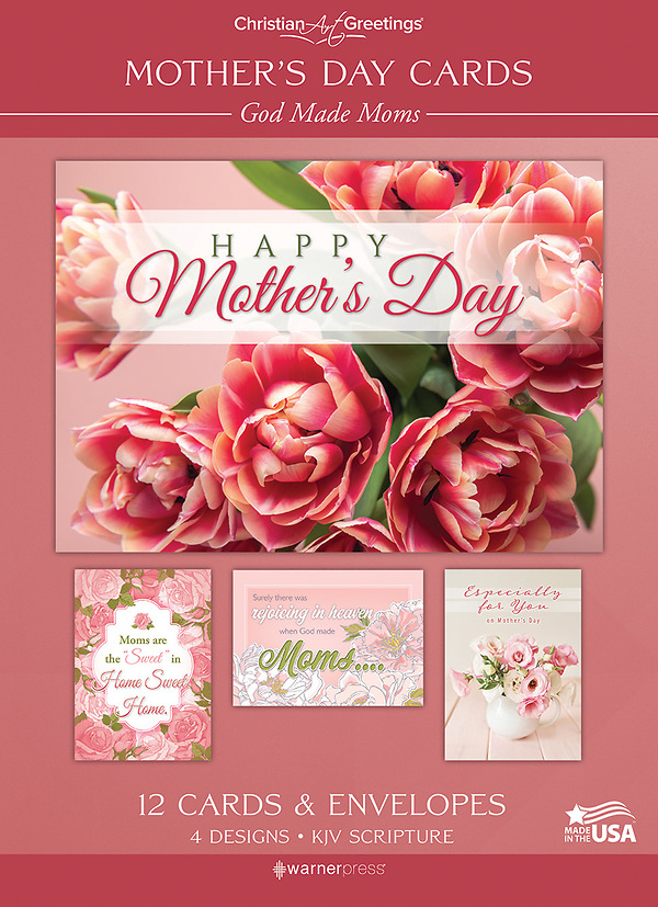 Honor mothers with this beautiful boxed set of 12 Mother's Day cards featuring KJV Scripture and 4 elegant floral designs. The "God Made Moms" collection celebrates maternal love through gorgeous imagery: coral tulips with "HAPPY Mother's Day," pink roses proclaiming "Moms are the Sweet in Home Sweet Home," a delicate floral sketch declaring "Surely there was rejoicing in heaven when God made Mom!...," and soft roses in a pitcher offering "Especially for You on Mother's Day."