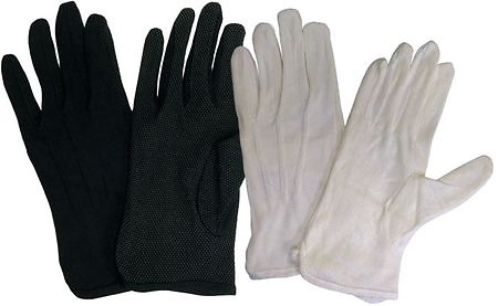 This 100% cotton glove in white or black has small soft plastic dots on the palm side for sure grip and easy page turning. Silk stitching on the backside for appearance. Available in five sizes.