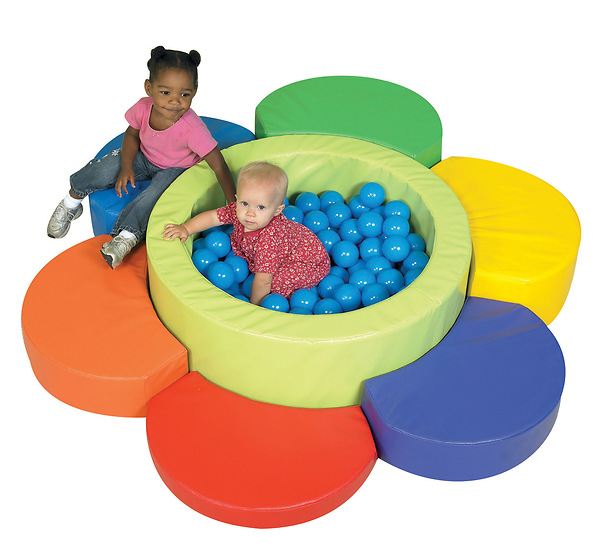 Little ones will love climbing up and over six brightly colored petals to get to the center of this rainbow flower. Petal platforms are set at different heights to encourage climbing crawling and balance skills. Each soft and sturdy shape is made of polyurethane foam covered in reinforced vinyl to create a safe comfortable and stimulating learning environment. This climber has a ball pool with attached vinyl flooring and an assortment of 130 brightly colored blue balls.