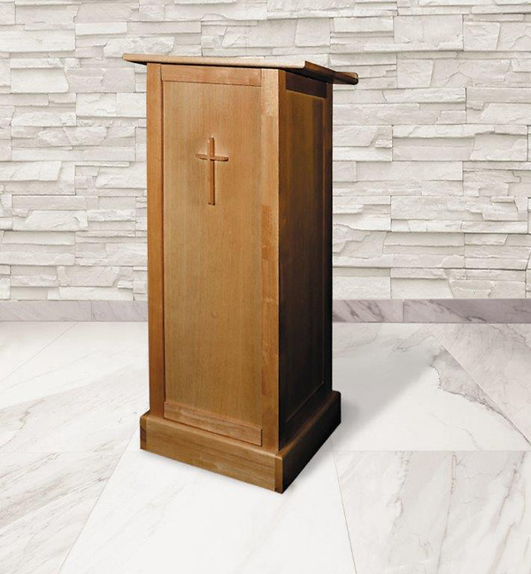 A very economical option for churches looking for a full lectern without compromising quality. Made of solid maple hardwood and finished in a pecan stain. Features a shelf undereath for Bibles, hymnals, etc. and large storage at the bottom. Overall height is 45" high. Top is 20" x 16", base is 11" square.