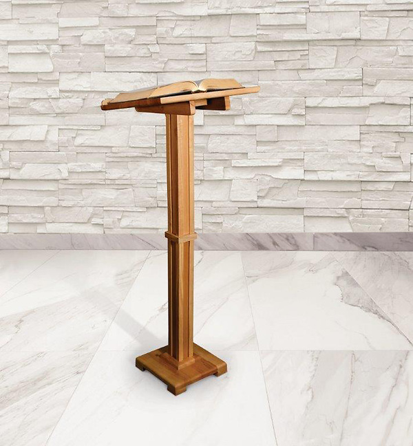 This lectern is a great option for those needing a lectren for a chapel, classroom, or meeting space at an economical price. This sleek deisgn is made of solid maple hardwood and finished in a pecan stain. Some Assembly required. Overal height is 43". Top is 16" wide by 15" deep. Base is 12" square.