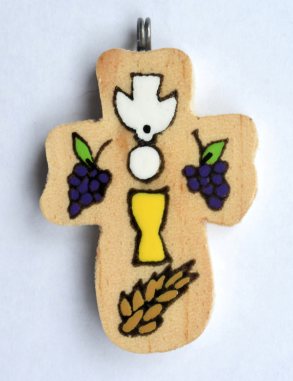 What better way for youth to show others their faith than with this beautiful, one-of-a-kind, hand-painted Jesus Eucharist Cross Necklace? This Claim the Name cross features the design of a descending dove, chalice, and palm leaf, with bunched grapes on either side of the cross of brown color background.
