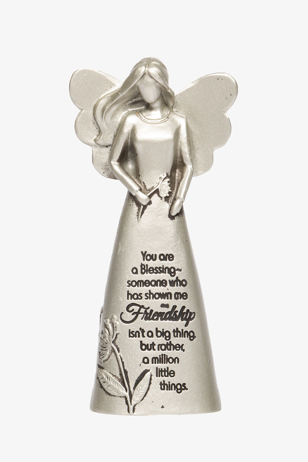 Graceful, sculpted angels with warm blessings for special people. Baked enamel silver finish. 5" Boxed.
