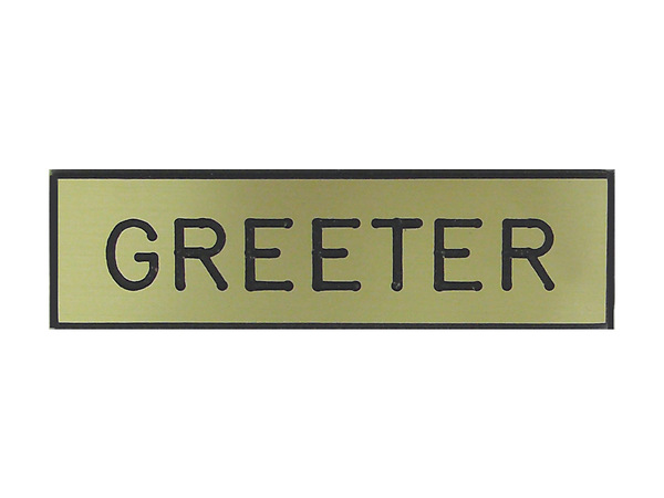 Brushed gold formica badge with GREETER engraved. Attaches via pin on the back. 5/8" x 2-1/4".