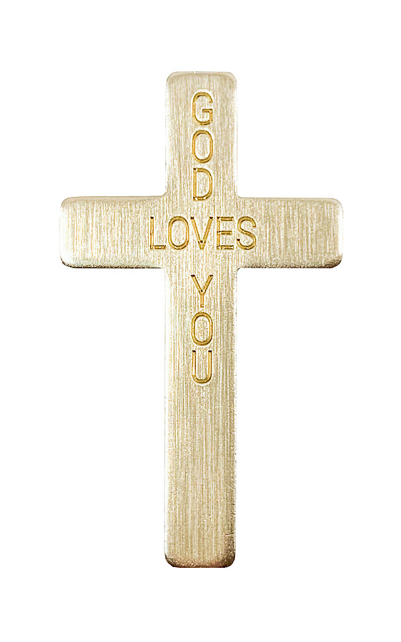 colored metal pocket cross with "God Loves You" engraved on the front. Does not include a card. Cross only. 1 3/4" long and 1" across.