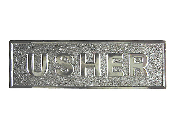 High polish badges have a satin finish background with polished letters and border. 5/8" x 2 1/8" Pin back style.
