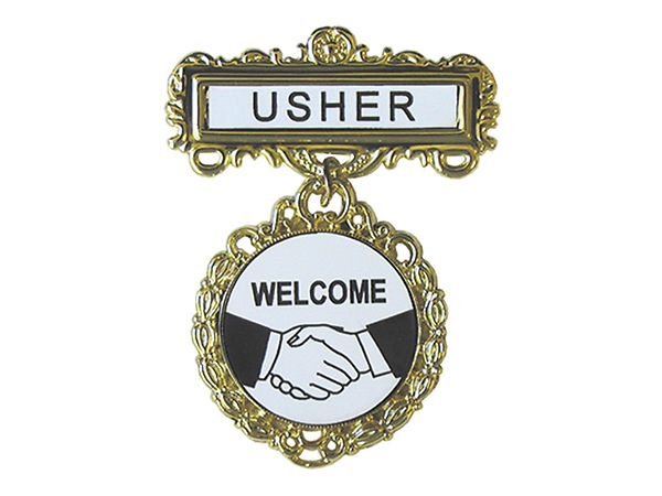 Medal style 3" badge with USHER at the top and WELCOME with hands shaking in the lower portion. Attaches via pin on back.