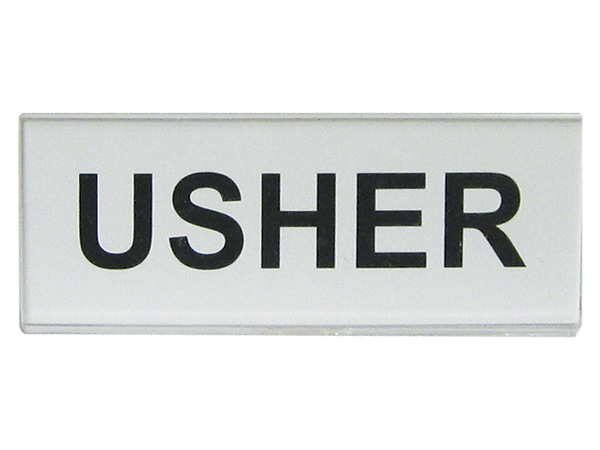 Clear acrylic badge with removable insert. 2-7/8" x 1-1/8". Attaches via combination safety pin/clip back.