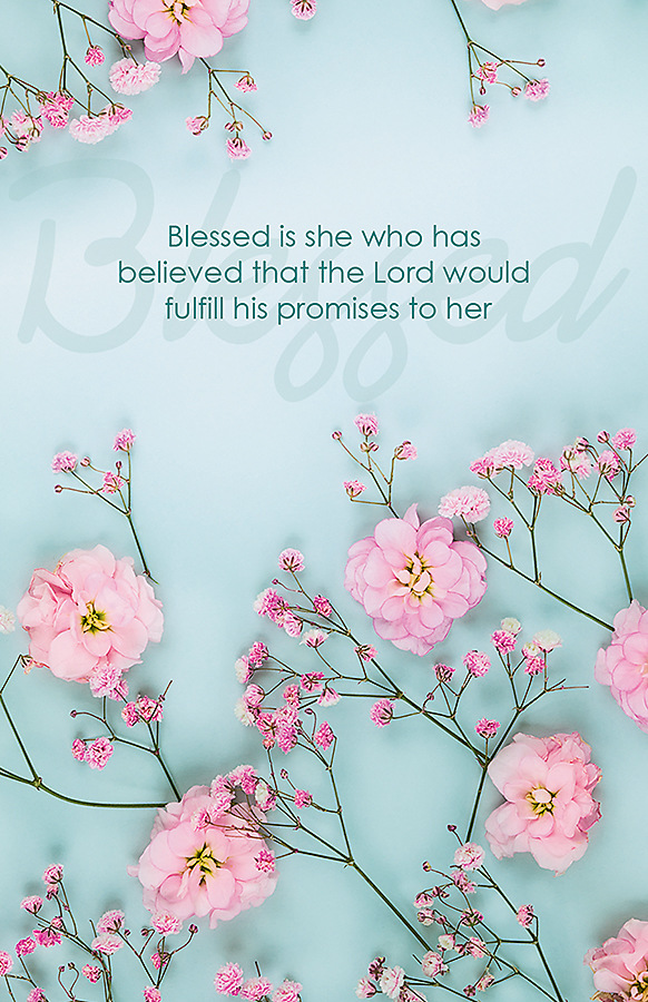 Text: Blessed is she who has believed that the Lord would fulfill his promises to her. Scripture Reference: Luke 1:45 (NIV). Size: 8.5" x 11" folds to 5.5" x 8.5"